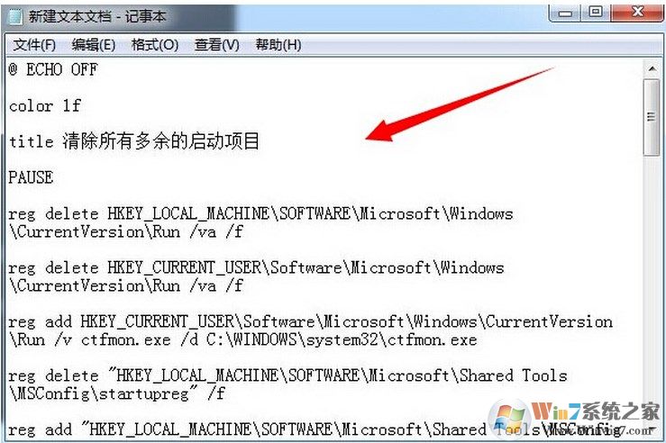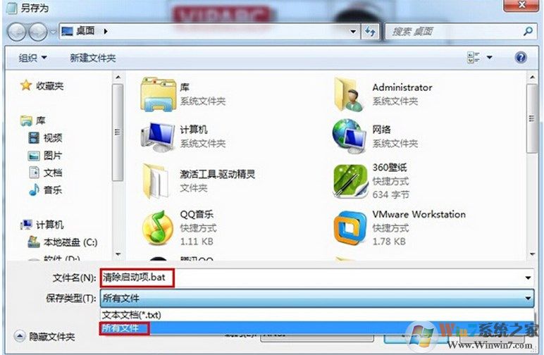3.点击左上角的"文件(F)"选择"另存为",把文件名定为"清除启动项.bat"保存文件类型选"所有文件"如下图所示