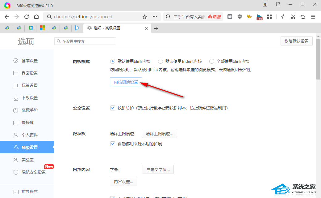 4. 在高级设置页面中,我们找到“内核模式”下的“内核切换设置”选项,点击打开该选项。