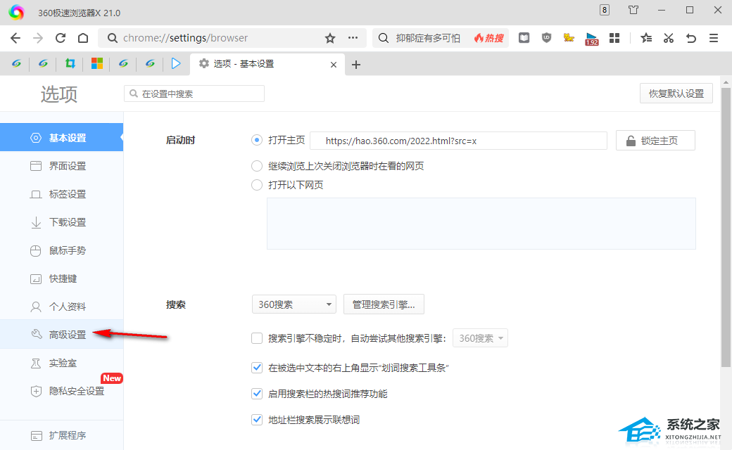 3. 进入360极速浏览器的设置页面之后,我们在左侧列表中点击打开“高级设置”选项。
