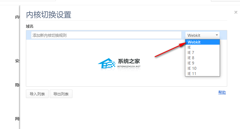 5. 进入内核切换设置页面之后,我们在该页面中打开如图所示选项,然后在下拉列表中点击选择“Webkit”选项即可。