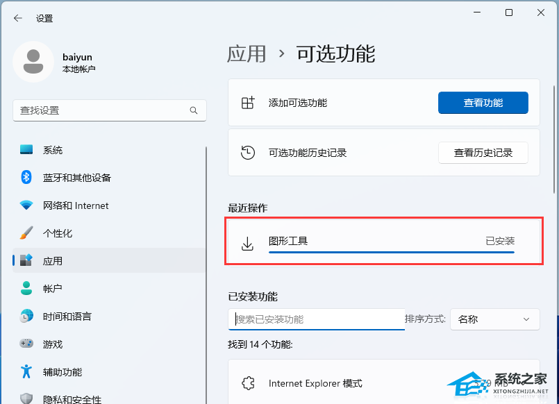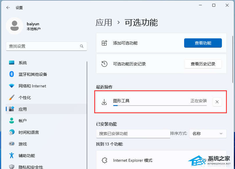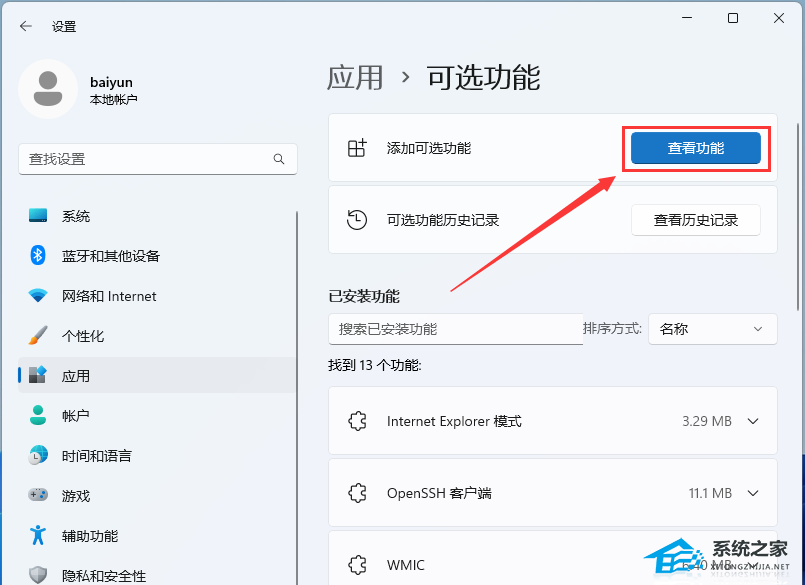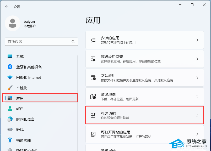 2. 设置窗口,左侧边栏,点击【应用】,右侧点击【可选功能(你的设备的额外功能)】。