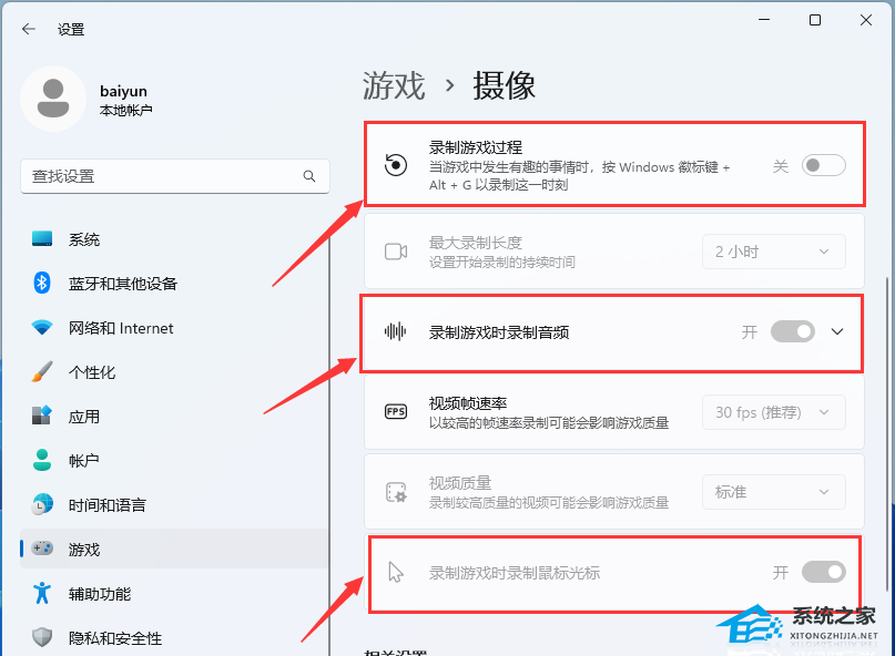 4. 接着再将【摄像】下的录制游戏过程、录制游戏时录制音频和录制游戏时录制鼠标光标【关闭】。