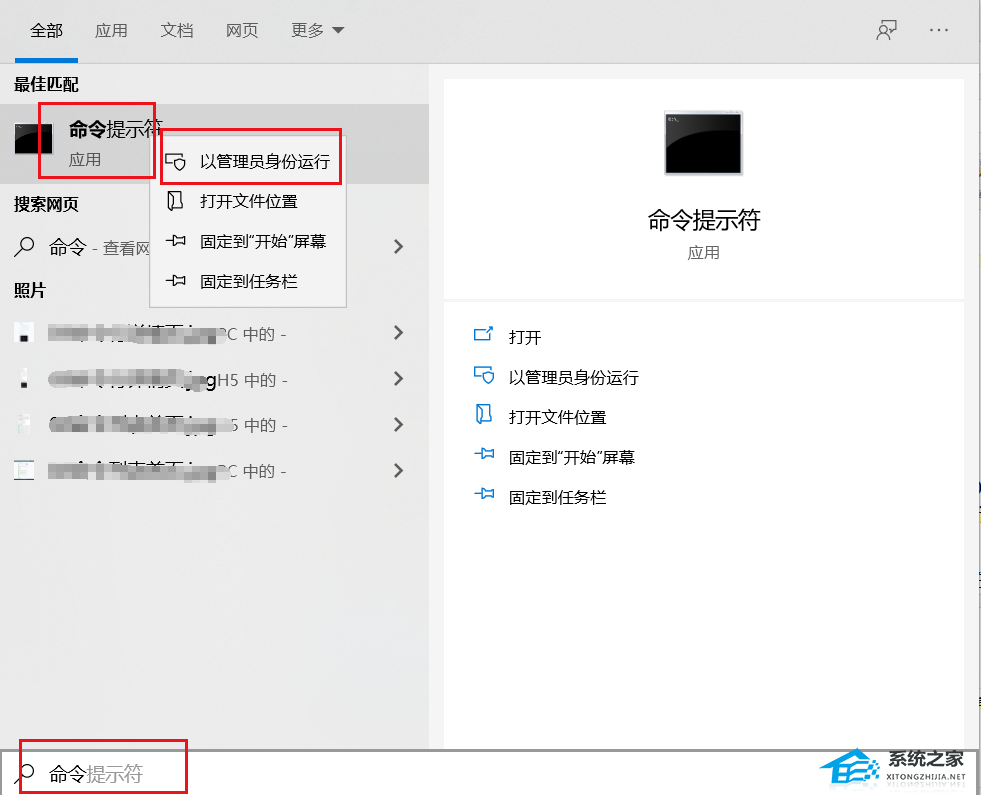 2. 左下角搜索命令,在命令提示符上单击右键,选择“以管理员身份运行”;