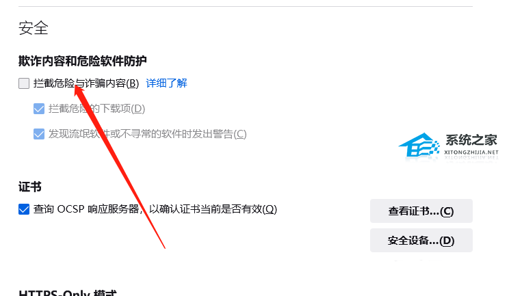 4、随后用户下划右侧页面,找到其中的欺诈内容和危险软件防护板块,并取消勾选下方的拦截危险与诈骗内容选项即可设置成功。