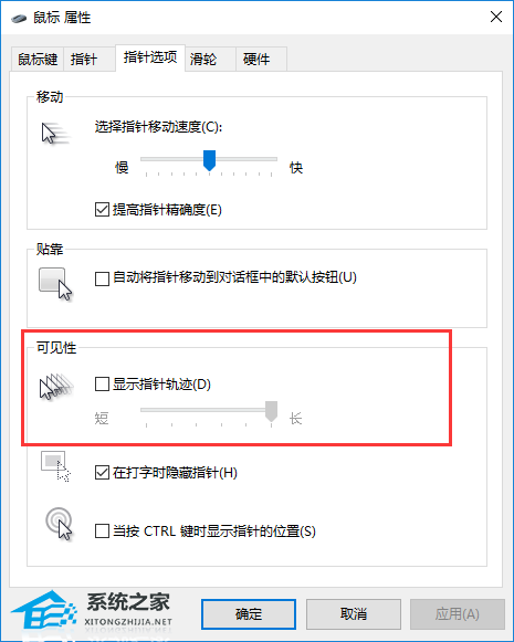 4. 最后选择“指针选项”将可见性中的“显示指针轨迹”勾选中,即可开启鼠标轨迹特效。
