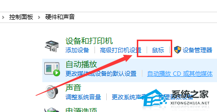 2. 然后在控制面板中选择“硬件和声音”,选择“鼠标”。