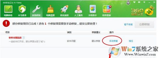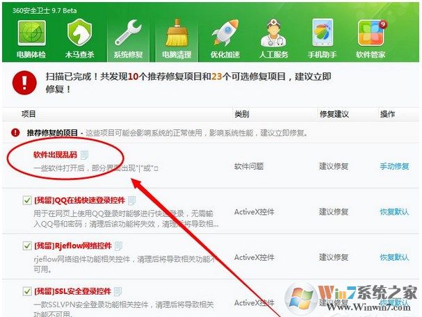 3、安装好Microsoft AppLocale后重启电脑,打开软件还是有乱码,这时就尝试另外的方法。在电脑上安装安全卫士软件,测试时使用的是360安全卫士,利用系统修复扫描系统,会显示一条软件出现乱码的错误,点击修复按钮开始修复;
