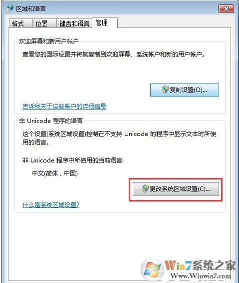 4、点击"管理选项"属性对话框中的"更改系统区域设置";