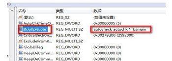 3、然后在窗口右侧找到"BootExecute"并双击打开,然后将数值数据中的"autocheck autochk *"删除,点击确定,重启计算机即可