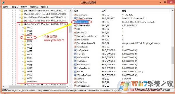 怎么找呢?其实在网络适配器里出现的所有项目,在注册表里都有对应,它们就是{4D36E972-E325-11CE-BFC1-08002BE10318} 的子项0000、0001、0002...等,比如笔者随便点击选中子项"0003",然后在注册表的右边找到"DriverDesc",它后面描述着"Realtek PCIe GBE Family Controller",其实这个就是笔者的笔记本的网卡型号,在设备管理器的网络适配器里有这个项目的,大家可以去第一个图中查看下哦。