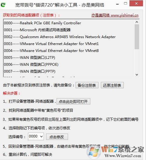 下载打开后,工具会自行获取注册表里的网络适配器项,然后备份注册表,如上图所示,直接点击备份按钮就可以了,即使误操作造成注册表损坏了,也可以通过点击还原按钮进行恢复。