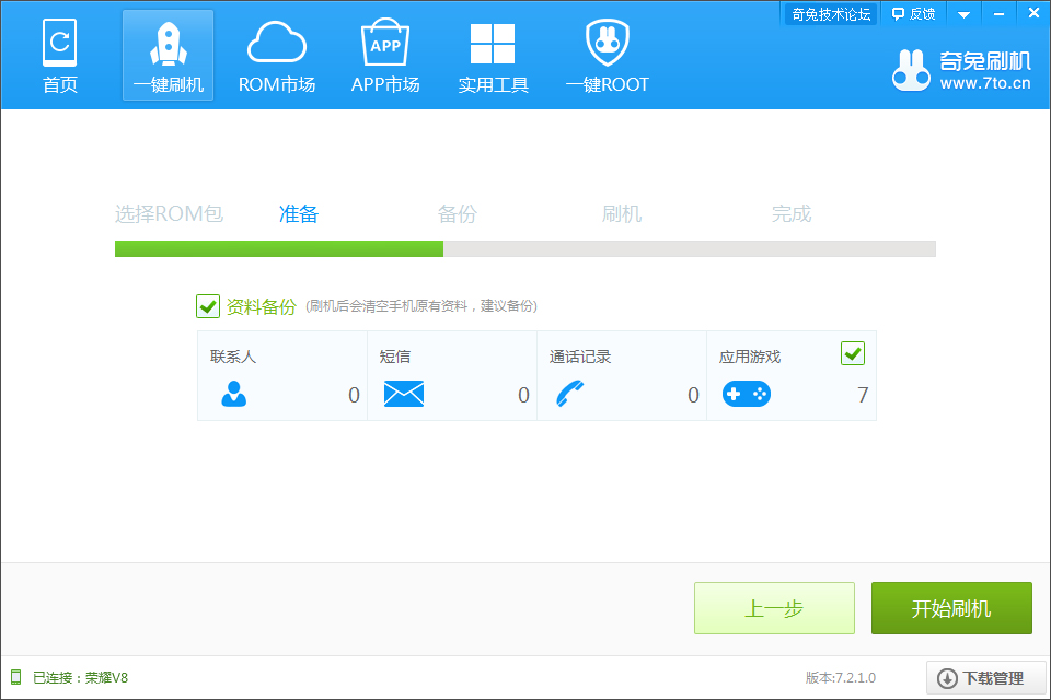 2.点击【一键刷机】,可以选择你要刷的荣耀V8全网通标准版(KNT-AL10 EMUI 5.0)ROM包,如果你还没有下载手机的刷机ROM包,可以在奇兔刷机ROM市场下载。选择好手机的刷机ROM包之后,进入资料备份界面,刷机会清除联系人, 短信, 通话记录和应用程序,建议大家备份,刷机后可以还原。