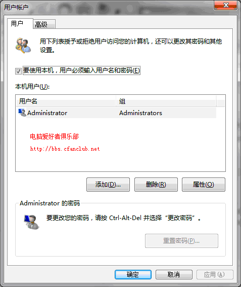 2、打开后如下图,在出现的"用户帐户"设置窗口中,取消"要使用本机,用户必须输入用户名和密码"的选择,
