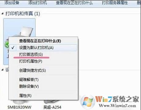 1、首先,打开"设备和打印机",右键点击HP打印机,选择"打印首选项"。