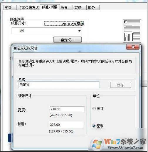 3、如果不能打印,那么可以尝试修改左方的"纸张大小"为合适的大小,或者点击"自定义"手动指定大小,试试能否打印。