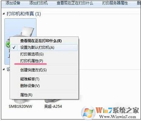 4、还是不行的话,回到打印机页面,右键有问题的打印机,选择"打印机属性"打开属性设置;