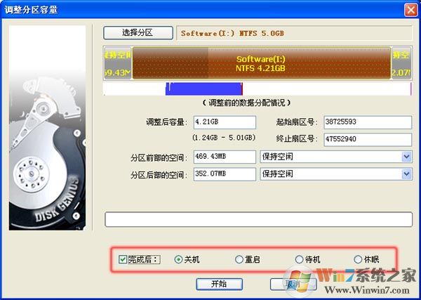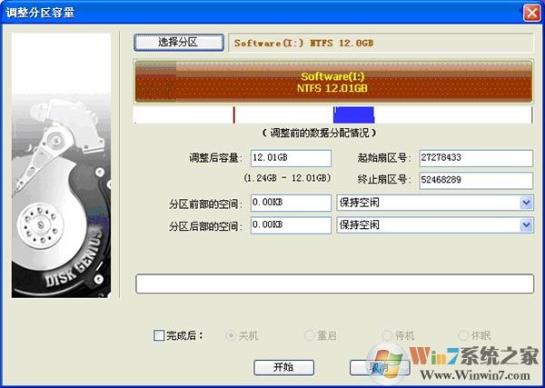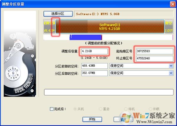 2、 调整分区大小时,DiskGenius支持鼠标操作,可以用鼠标改变分区大小,移动分区位置,切换调整后空间的处理选项等;也可以直接指定调整后的分区大小,对于有特殊要求的用户,还可以设置准确的起始与终止扇区号,如下图: