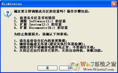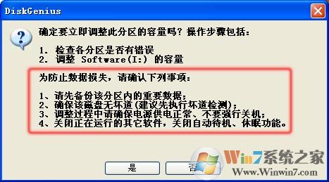 DiskGenius在开始分区调整操作时,也会提示您这一点,如下图:
