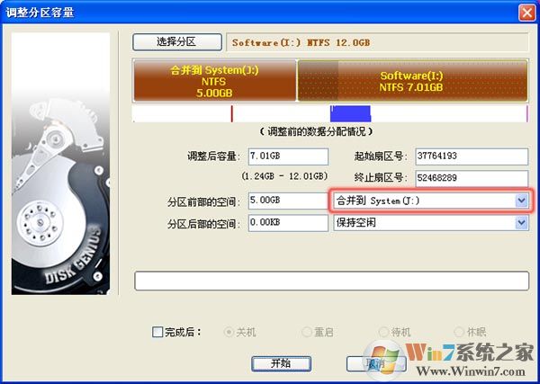 b. 显然,一般情况下,我们不会让磁盘空间空闲,点击后面的下拉框,选择"合并到J:"如下图所示;