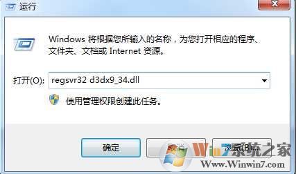 3、然后打开"开始-运行-输入regsvr32 d3dx9_34.dll",回车即可解决错误提示。