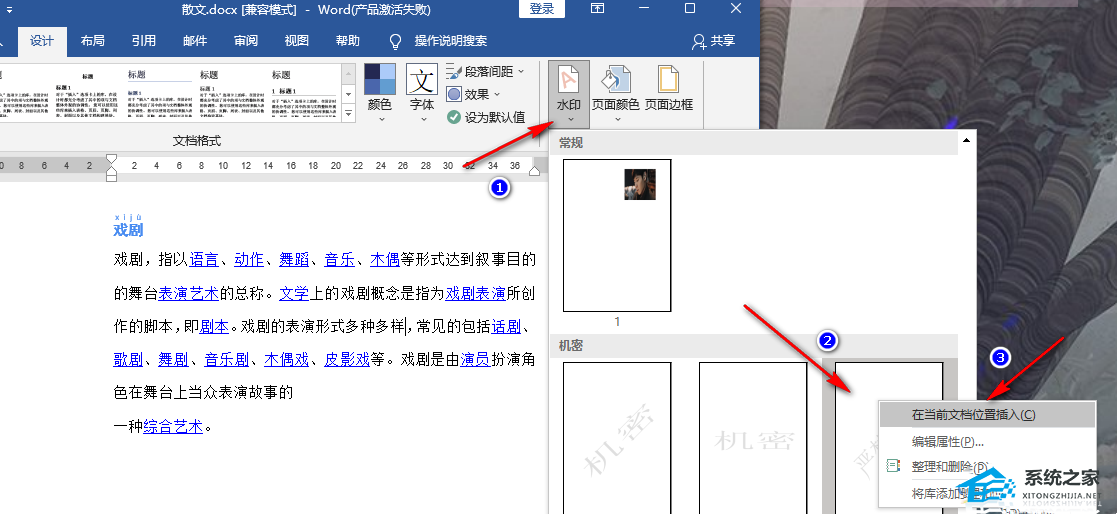 3、打开“设计”工具之后,我们在其子工具栏中找到并打开“水印”工具,然后在下拉列表中选择一个自己需要的水印,右键单击该水印,然后点击“在当前文档位置插入”选项。