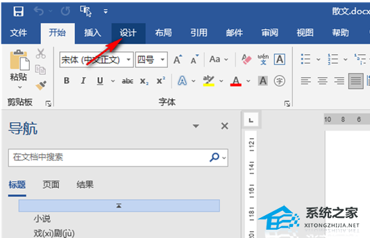 2、进入Word页面之后,我们在该页面上方的工具栏中找到“设计”选项,点击打开该选项。