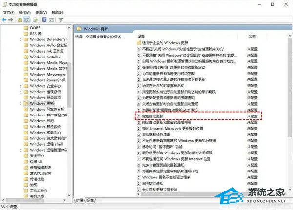 2. 在本地组策略编辑器中,依序点击“电脑配置”>“管理模板”>“Windows组件”>“Windows更新”,接着寻找“配置自动更新”并双击打开。