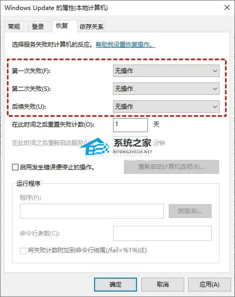 4. 接着点击“恢复”,将窗口中的选项全部设定为“无操作”,然后点击“应用”和“确定”。