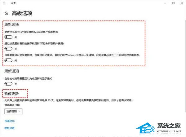 3. 在高级设置界面,可选择在“更新设置”部分关闭所有项目,或点击“暂停更新”,但需注意,此暂停功能只能维持35天,到达时间后,需要先更新,才能再次暂停。