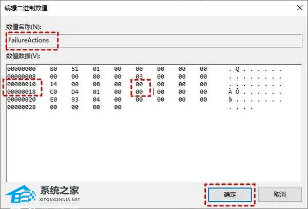 4. 找到“FailureActions”并双击它,将“00000010”和“00000018”中的“01”改为“00”,然后再次点击“确定”。