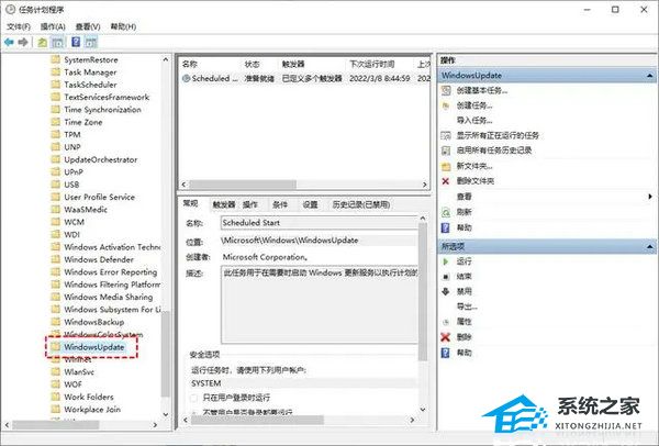 2. 在任务计划程序的界面中,导航至“任务计划程序库/Microsoft/Windows/WindowsUpdate”路径。