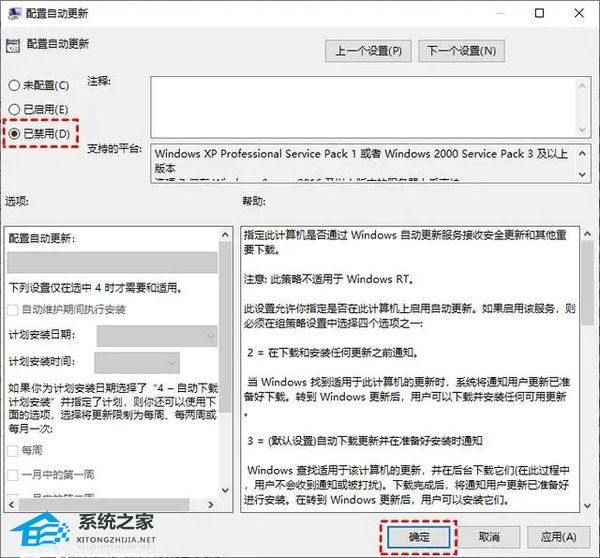 3. 在弹出的“配置自动更新”窗口中,选择“已禁用”,然后点击“确定”。