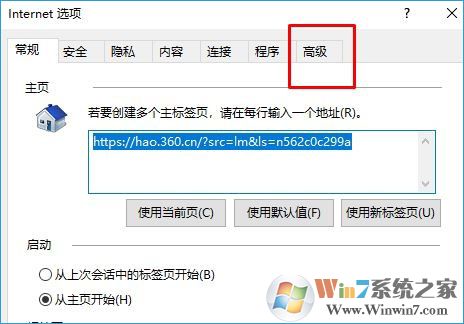 2、在internet 选项 界面切换到【高级】选卡;
