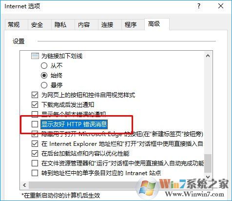 3、切换到【高级】选卡下,在设置列表中找到"显示友好HTTP错误信息",取消其勾选状态,点击确定即可;