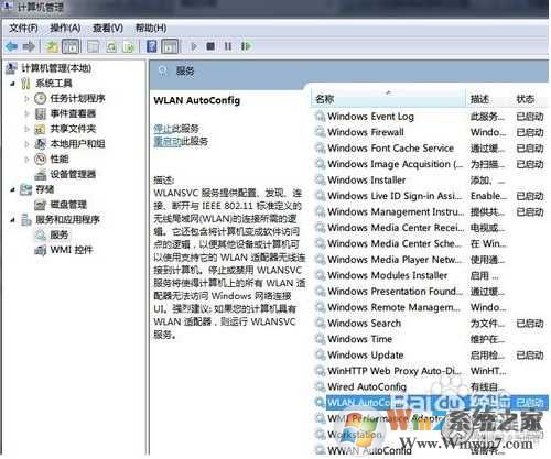 开启WLAN AutoConfig无线网络服务,右键开始菜单中的 计算机>管理>服务和应用程序>服务,找到WLAN AutoConfig一项,双击,选择启动即可。