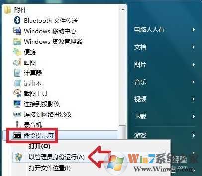 1、开始→所有程序→附件→右键点击命令提示符(CMD)→以管理员身份运行www.winwin7.com