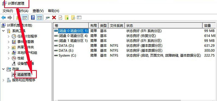 2、在左侧菜单中选择“磁盘管理”。
