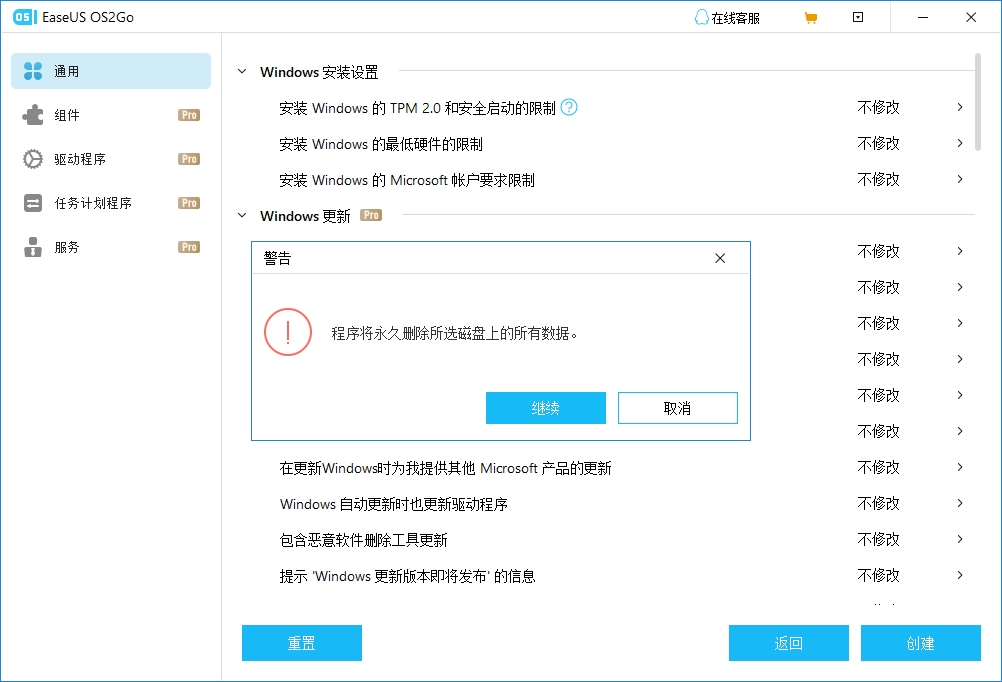 步骤 2. EaseUS OS2Go将提示您以下操作将删除驱动器上的所有数据。确保您的数据已备份后,单击“继续”按钮继续。