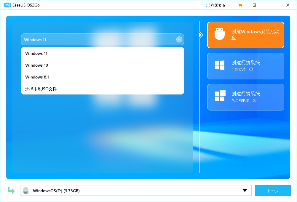 步骤 1. 在Windows计算机上安装EaseUS OS2Go,它将显示系统驱动器的已用空间。插入大于系统驱动器已用空间的 USB 驱动器或其他外部硬盘。选择“创建Window安装启动盘”,根据你的需求选择系统版本,比如Windows11,然后等待软件识别到目标 USB 驱动器后,单击“下一步”继续。