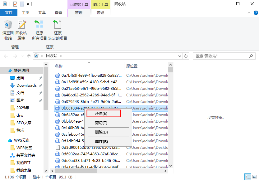3.右键点击选中的文件,选择“还原”选项,文件将被恢复到原来的位置。