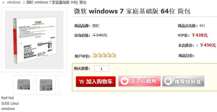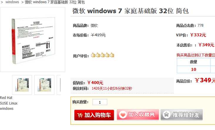 微软 windows 7 家庭基础版 64位 简包价格为 400人民币左右 32位的价格则要更低一些,在330元左右。