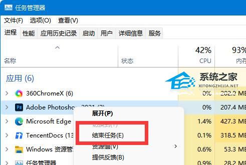 3. 然后右键所有正在运行的应用,点击“结束任务”。