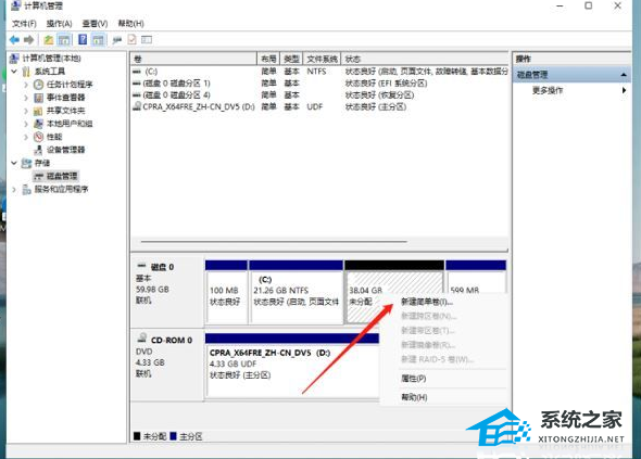 5. 压缩完成后,会出现一个未分配的分区,右键选择它,新建简单卷。