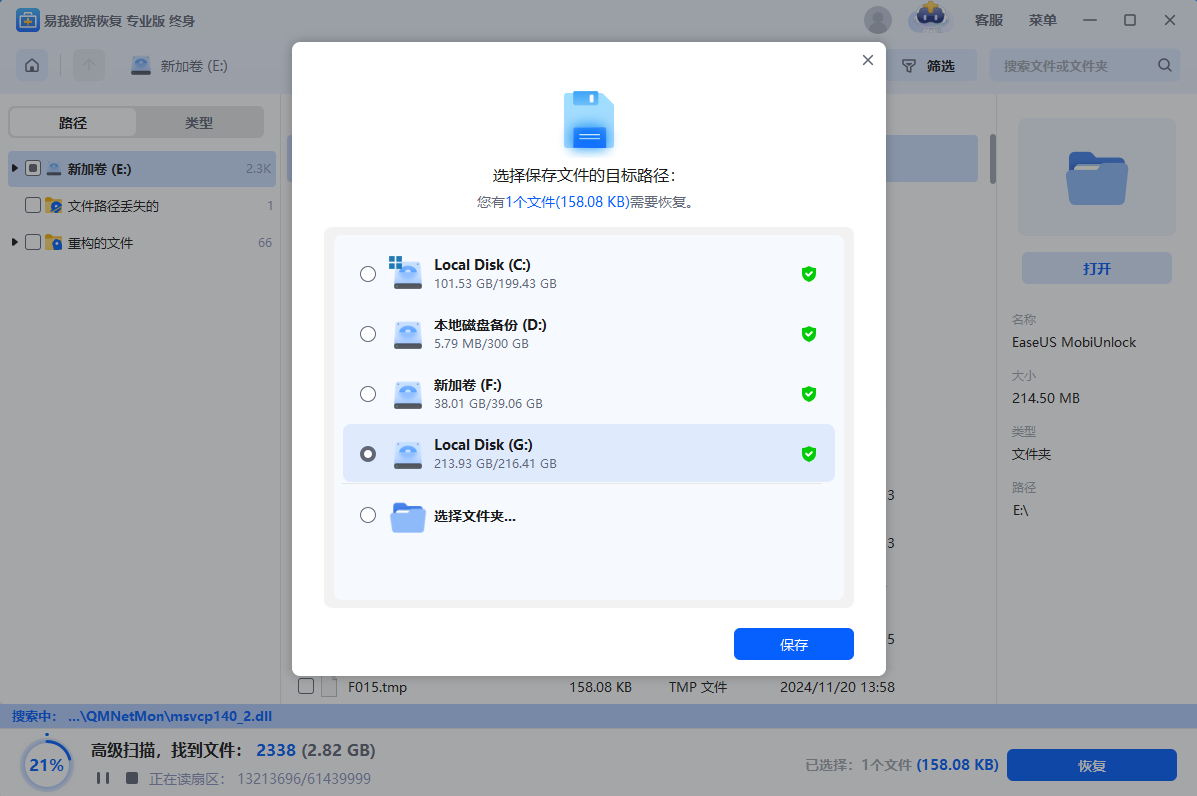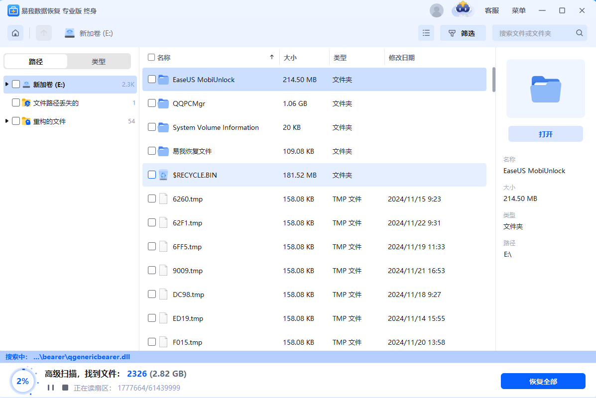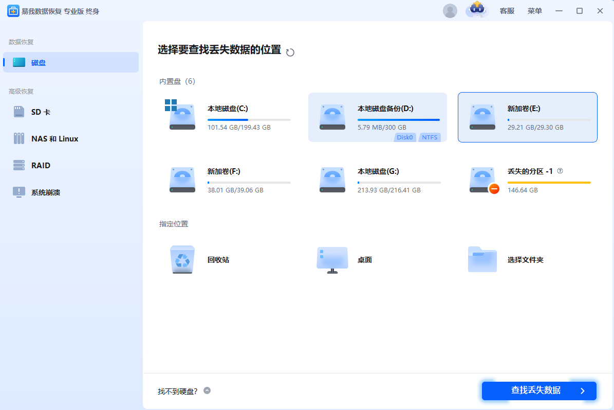 市面上的数据恢复软件通常具有友好的用户界面和强大的恢复功能。例如,易我数据恢复(EaseUS Data Recovery Wizard)软件就是一款支持多种操作系统和存储设备的专业数据恢复工具。通过这款软件,你只需使用软件扫描指定存储位置,软件将可以帮你找到其中丢失的各种文件数据,找到之后,动动手指点击恢复即可。