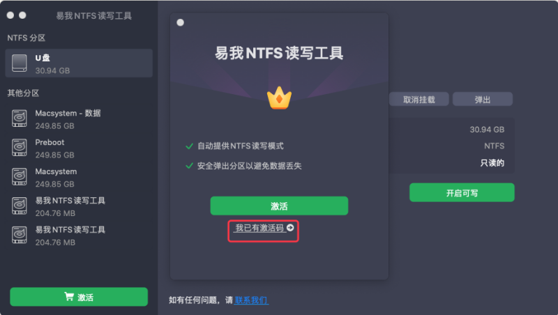 步骤 1. 在Mac电脑上开启并启用易我NTFS读写工具。单击“我已有激活码”,输入激活码以解锁此软件。