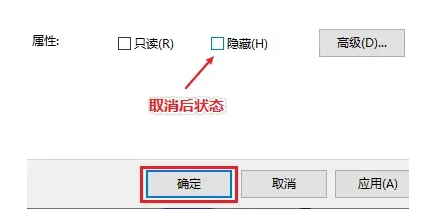 3、如果找到被隐藏的文件或文件夹,右键点击选择“属性”,在属性窗口中取消勾选“隐藏”选项,点击“确定”即可恢复。