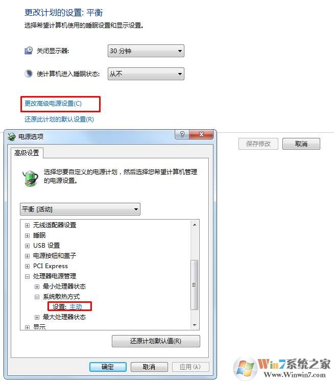 当然还可以通过系统电源计划管理——高级电源设置中来设置大概的风扇转速,大家可以设置为主动散热来提高转速、被动降低CPU风扇转速,如下图。