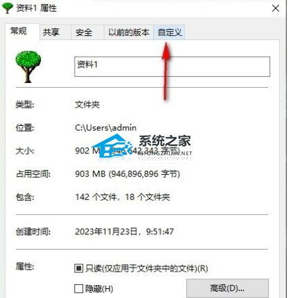 2. 进入该文件的属性页面之后,在页面上方点击打开“自定义”选项。
