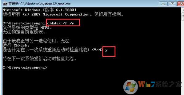 2、在命令提示符下输入"chkdsk /f /r"按回车,然后按y,下次重新启动电脑时,操作系统会自动修复硬盘。
