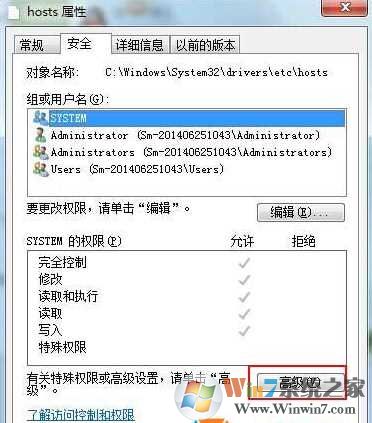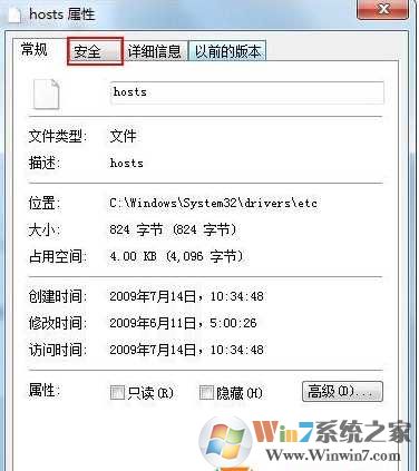 2、在文件属性页面切换到【安全】选项卡,并点击下方【高级】按钮;www.winwin7.com 整理
